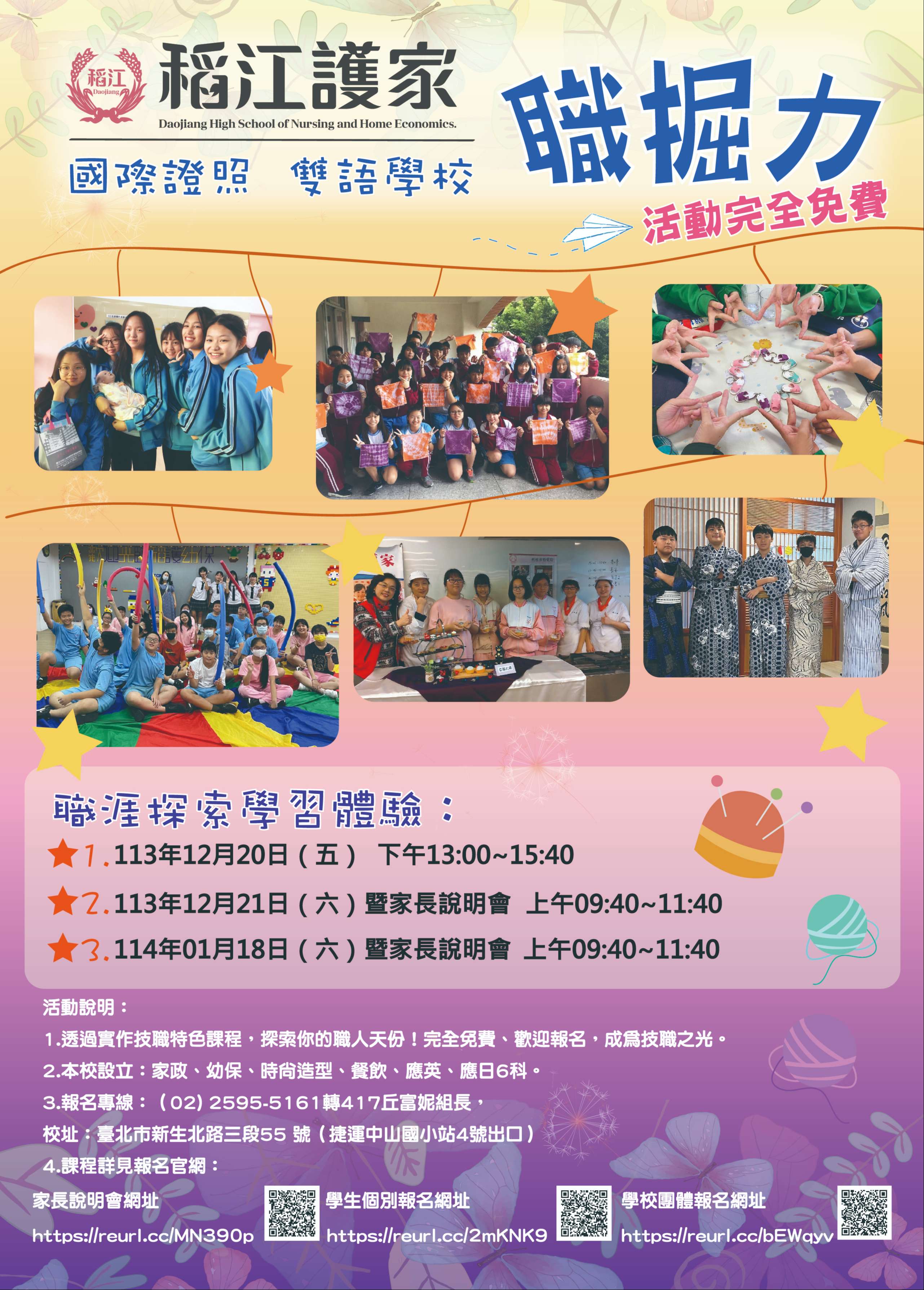 二、本學期於113年12月20日(五)、12月21日(六)、114年1月18日(六)辦理「稻江護家職掘力實作體驗」,誠摯邀請 貴校八、九年級學生參加,並歡迎 貴校教師或學生家長共同參與。