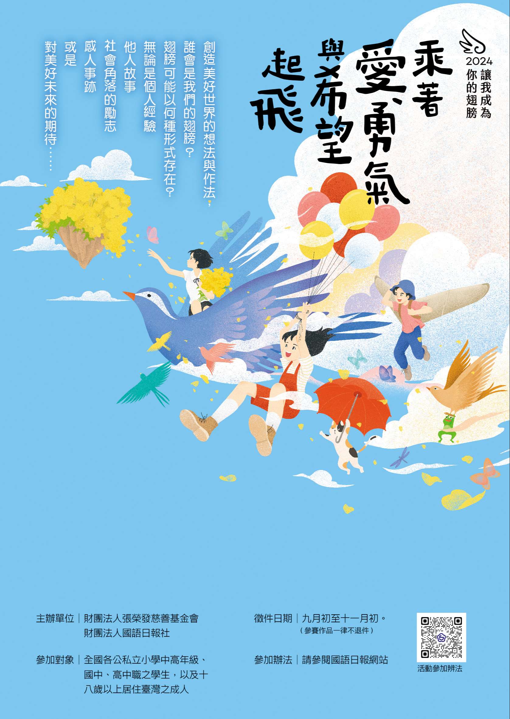 一、為了鼓勵正面助人的精神,強調社會連結與人際支持的重 要,本社與張榮發慈善基金會合辦「2024讓我成為你的翅 膀──乘著愛、勇氣與希望起飛」徵件活動。