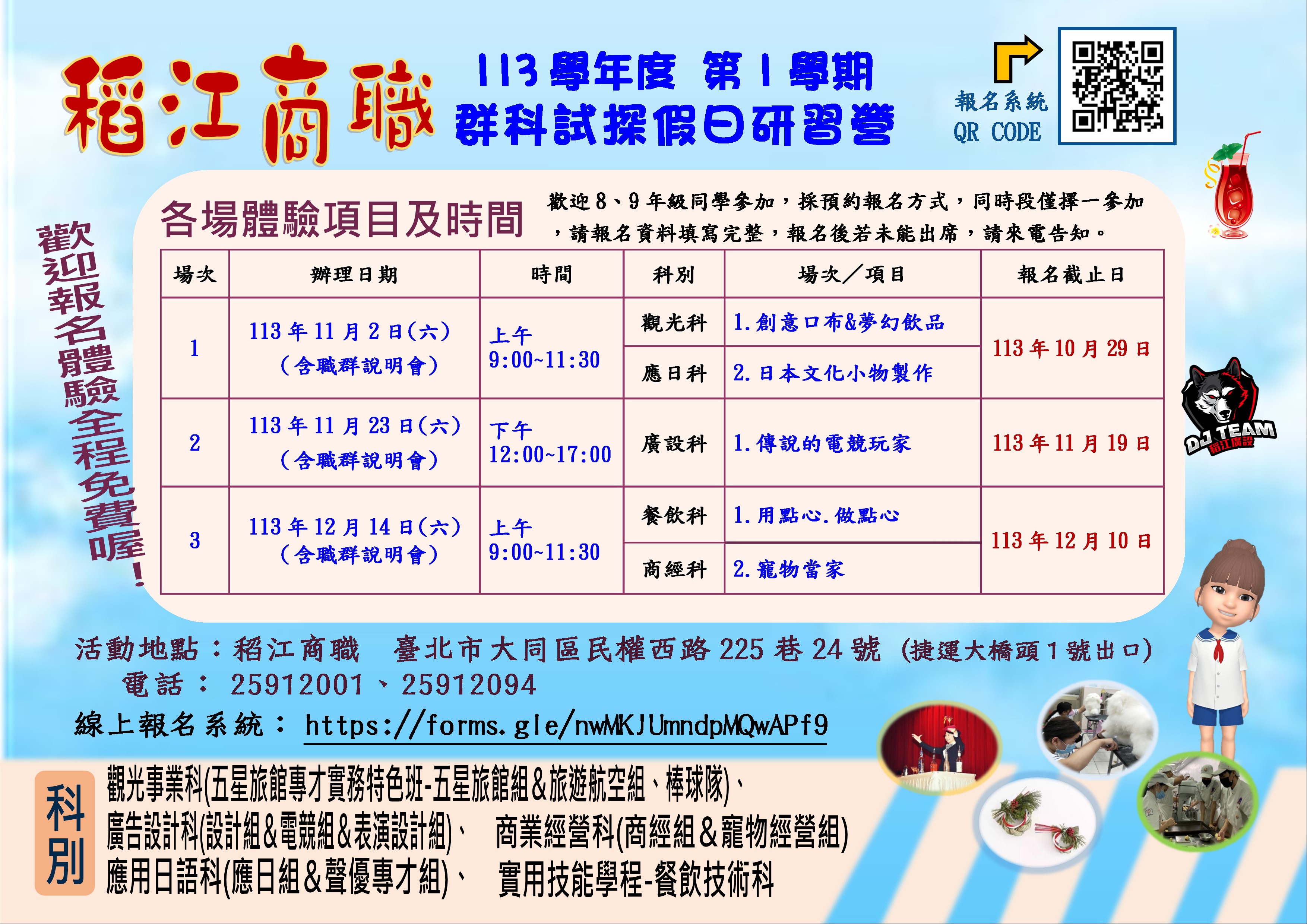 二、為了讓國中學生能對技職學校各群科多元探索,本學期本 校辦理3場假日體驗活動及海報,如附件,敬請協助予以公 告,歡迎國中生踴躍至本校線上報名https://forms.gle /nwMKJUmndpMQwAPf9,參加體驗,活動全程免費。