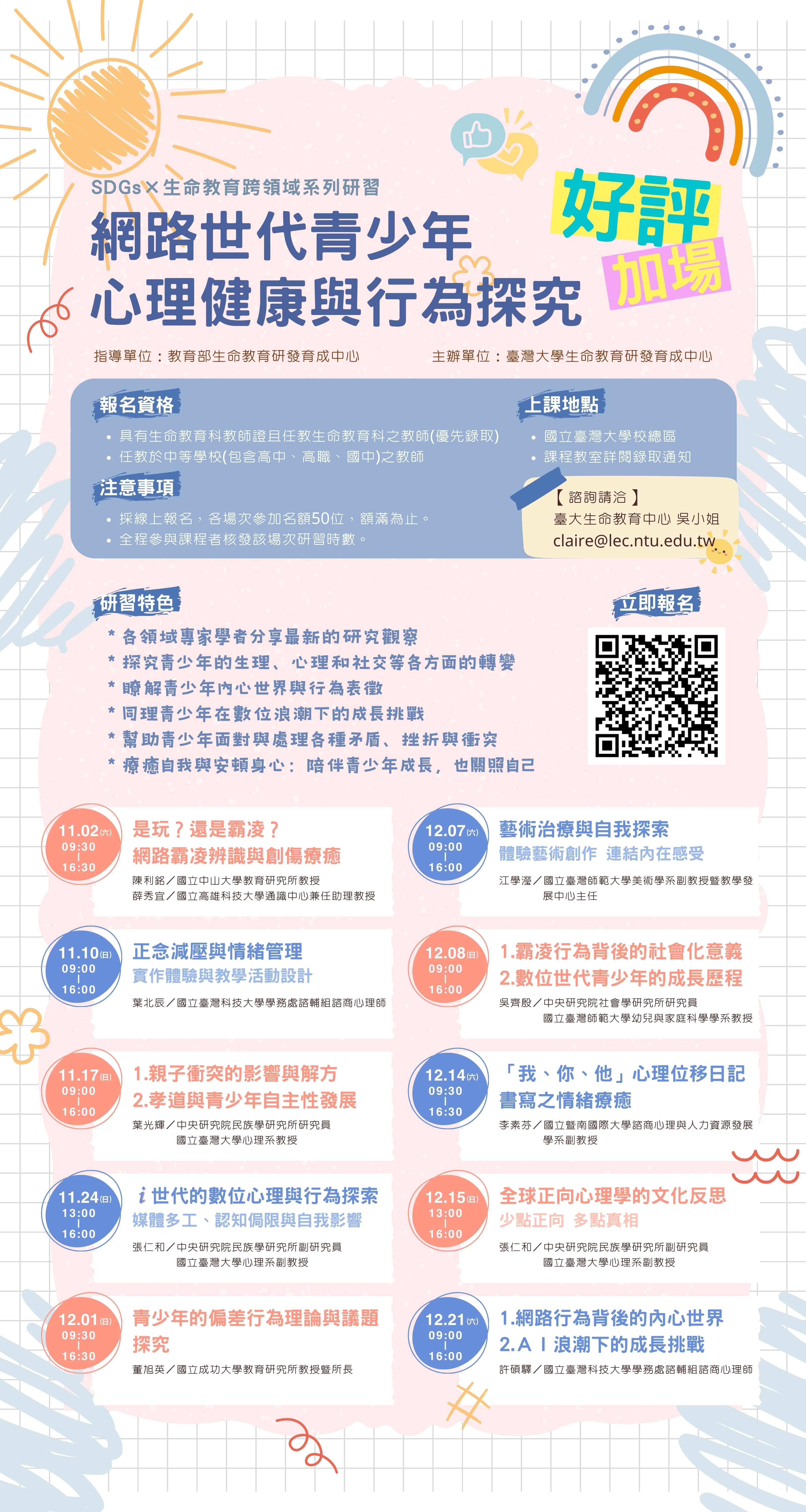 (一)研習場次: 1、11月2日(星期六):網路霸凌辨識與創傷療癒。 2、11月10日(星期日):正念減壓與情緒管理。 3、11月17日(星期日):親子衝突的影響與解方、孝道與 青少年自主性發展。 4、11月24日(星期日):i世代的數位心理與行為探索。 5、12月1日(星期日):青少年的偏差行為理論與議題探 究。 6、12月7日(星期六):藝術治療與自我探索。7、12月8日(星期日):霸凌行為背後的社會化意義、數位 世代青少年成長歷程。 8、12月14日(星期六):心理位移日記書寫之情緒療癒。 9、12月15日(星期日):全球正向心理學的文化反思。 10、12月21日(星期六):網路行為背後的內心世界、AI 浪潮下的成長挑戰。