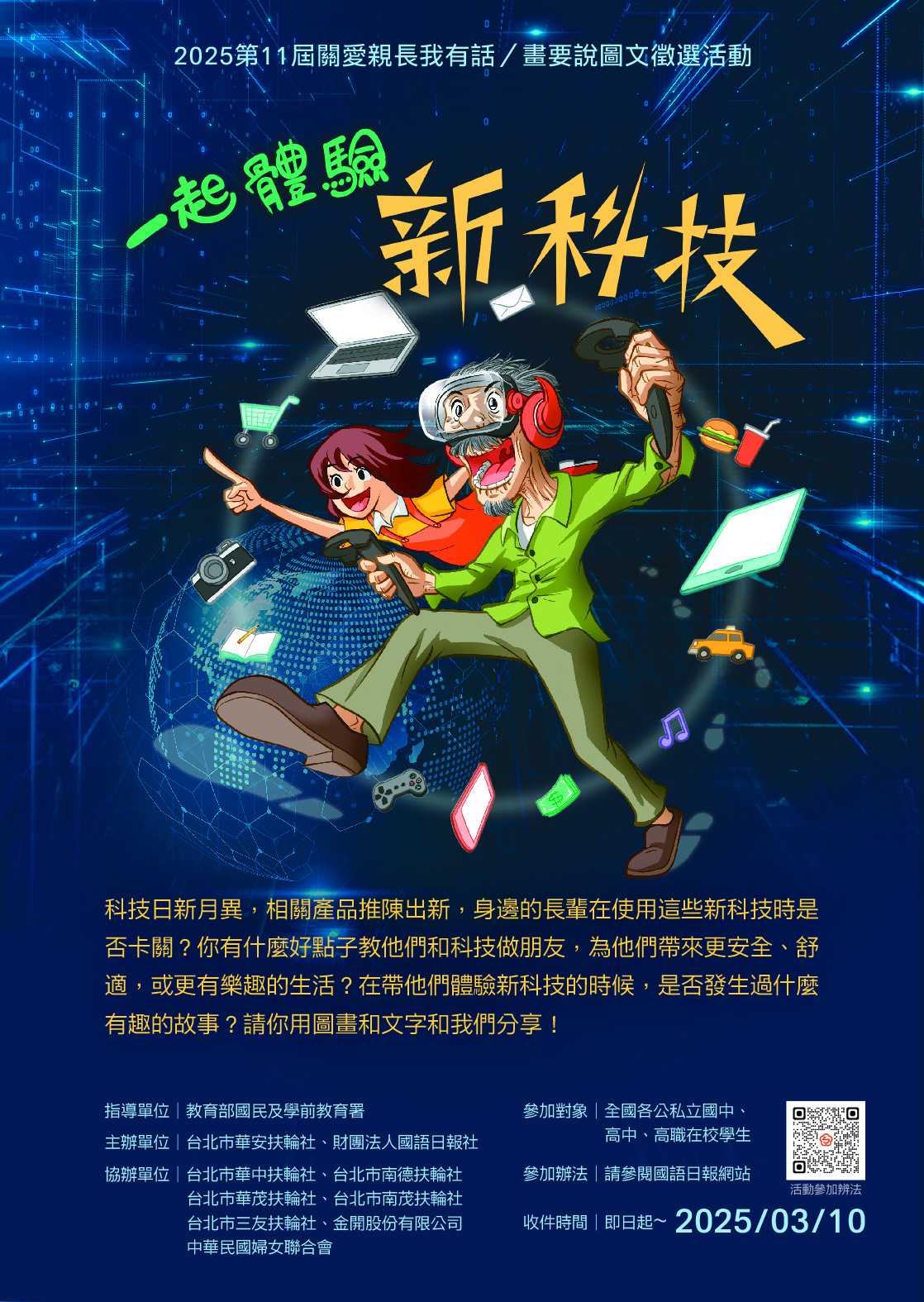 一、為鼓勵高級中等學校及國民中學學生勇於表達對親長的關愛,財團法人國語日報社與臺北市華安扶輪社共同辦理第11屆「關愛親長 我有話/畫要說」圖文徵選活動。