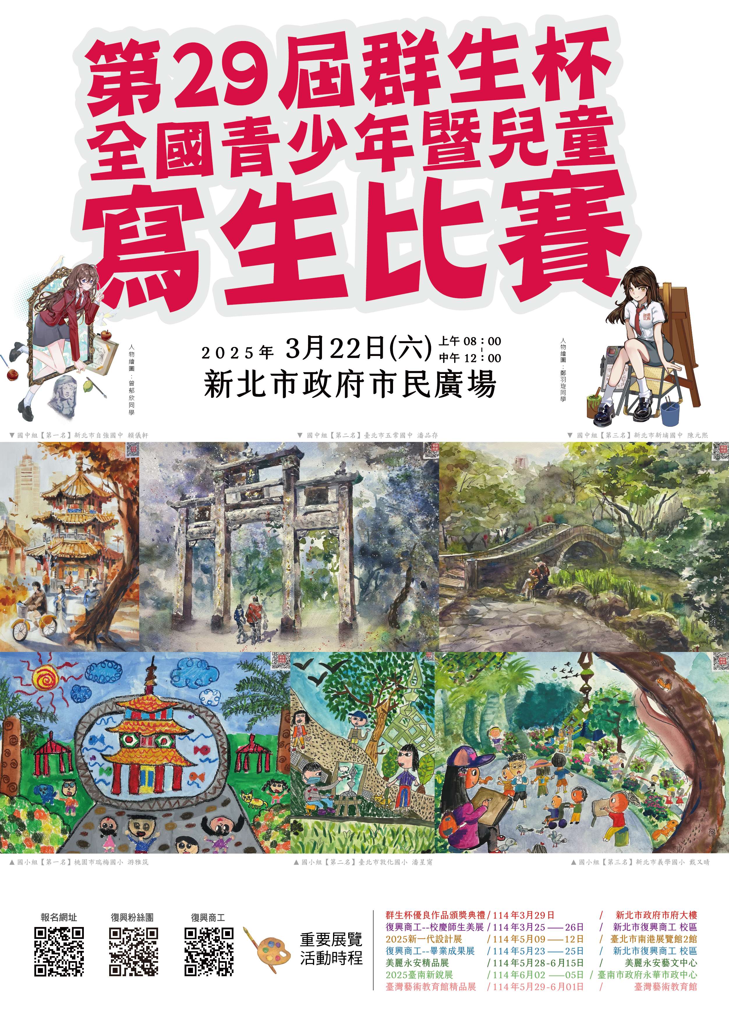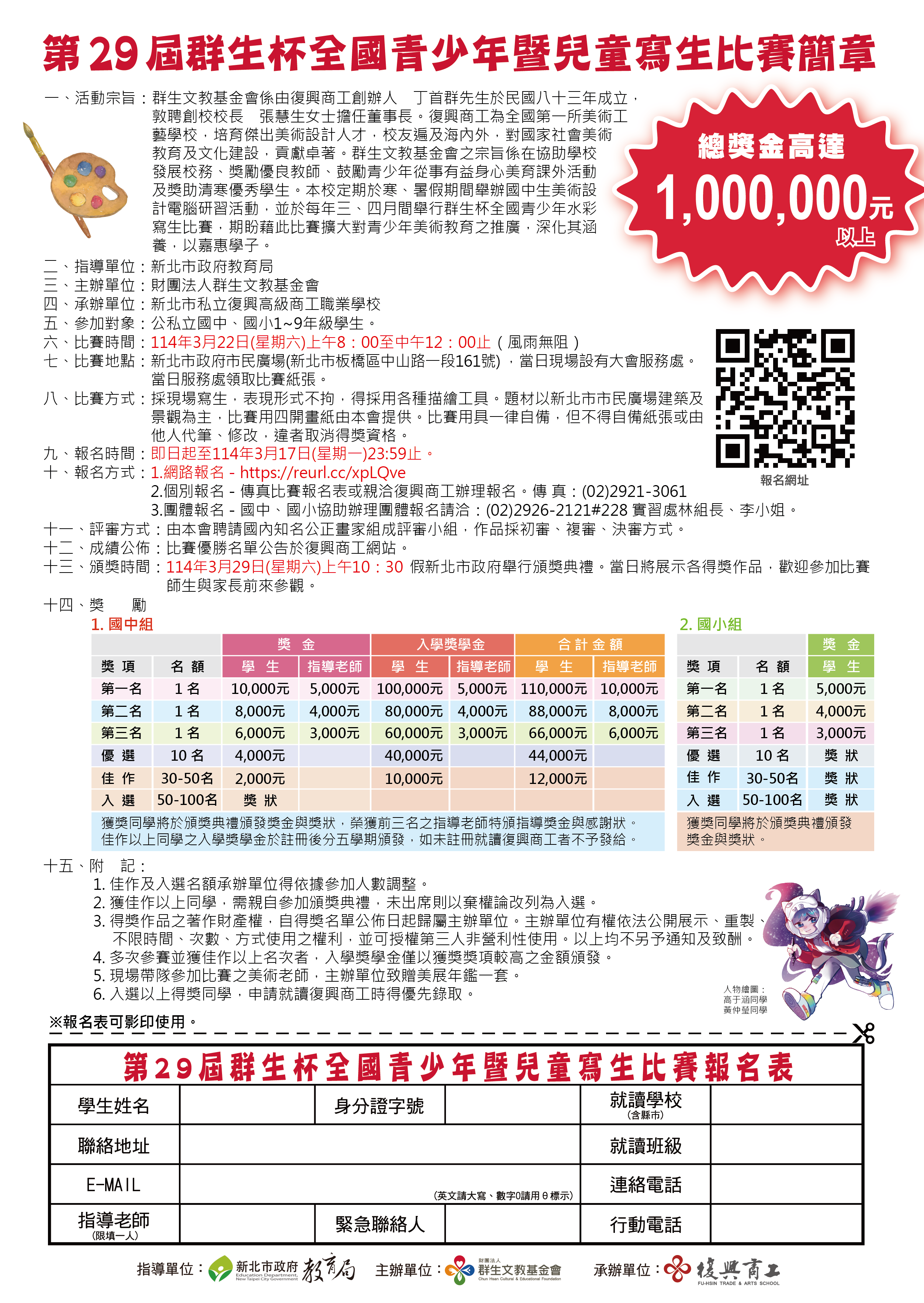 五、線上報名網址: https://reurl.cc/xpLQve(即日起至114年3月17日(一)23:59止)六、比賽簡章公告於群生基金會網站首頁 http://ischool.fhvs.ntpc.edu.tw/ischool/publish_page/193/,敬請下載查閱。