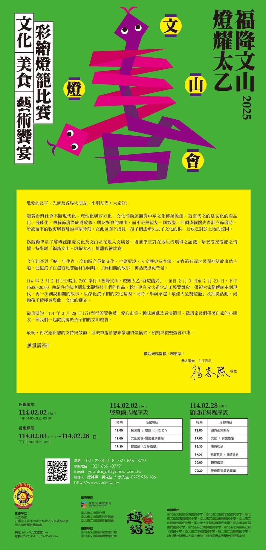 (一)點燈儀式:114年2月2日下午4時至6時,安排傳統元宵燈節搓元宵、持火把、走靜貓空等活動。
