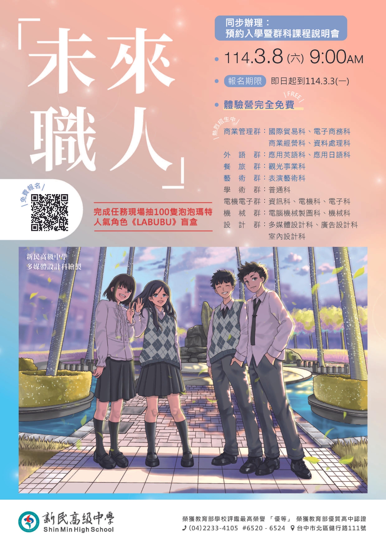 (三)特色招生術科測驗報名:即日起至3月14日(星期 五)。
