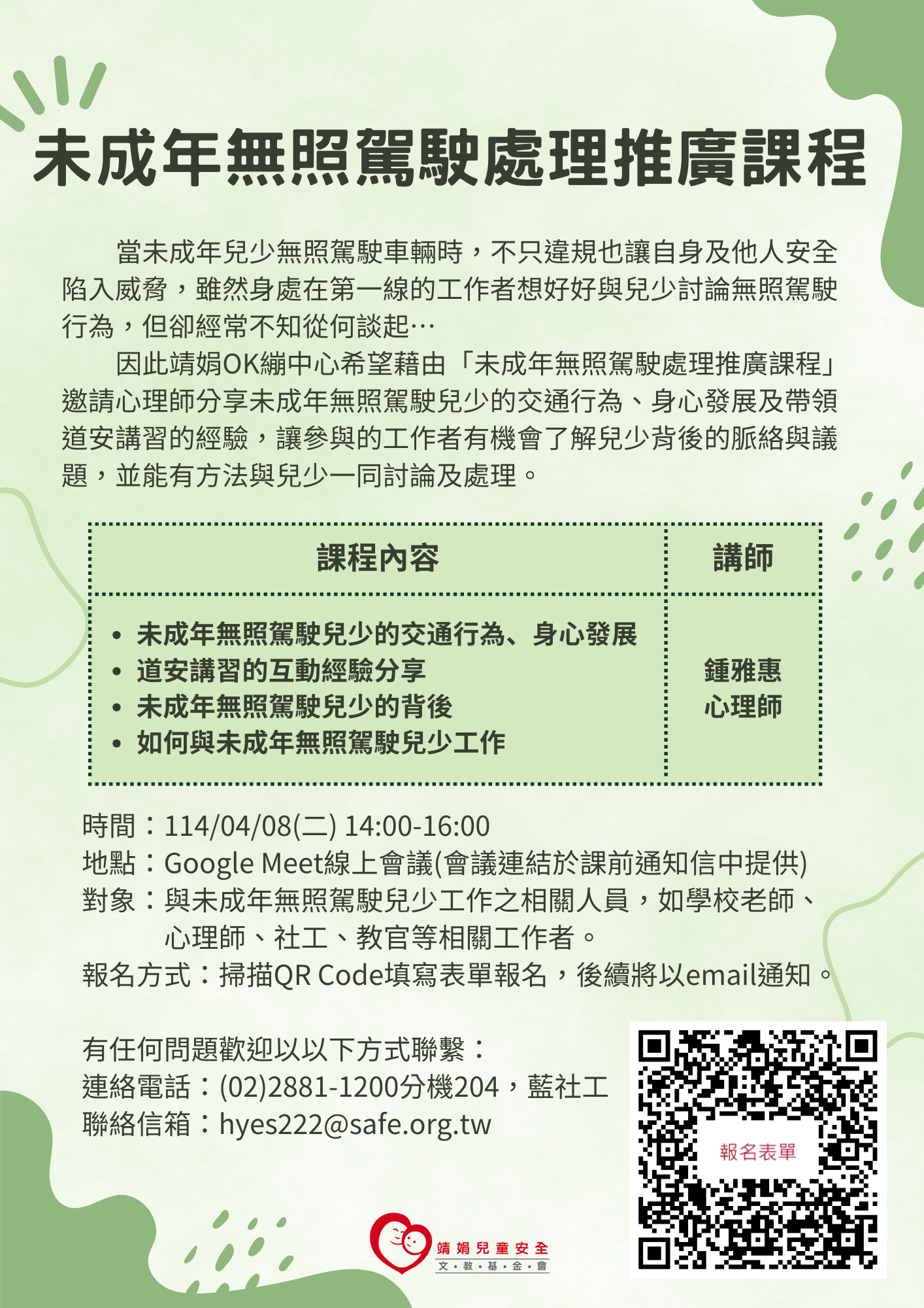 一、依據財團法人靖娟兒童安全文教基金會114年2月26日114靖 娟北總字第1140000090號函辦理。