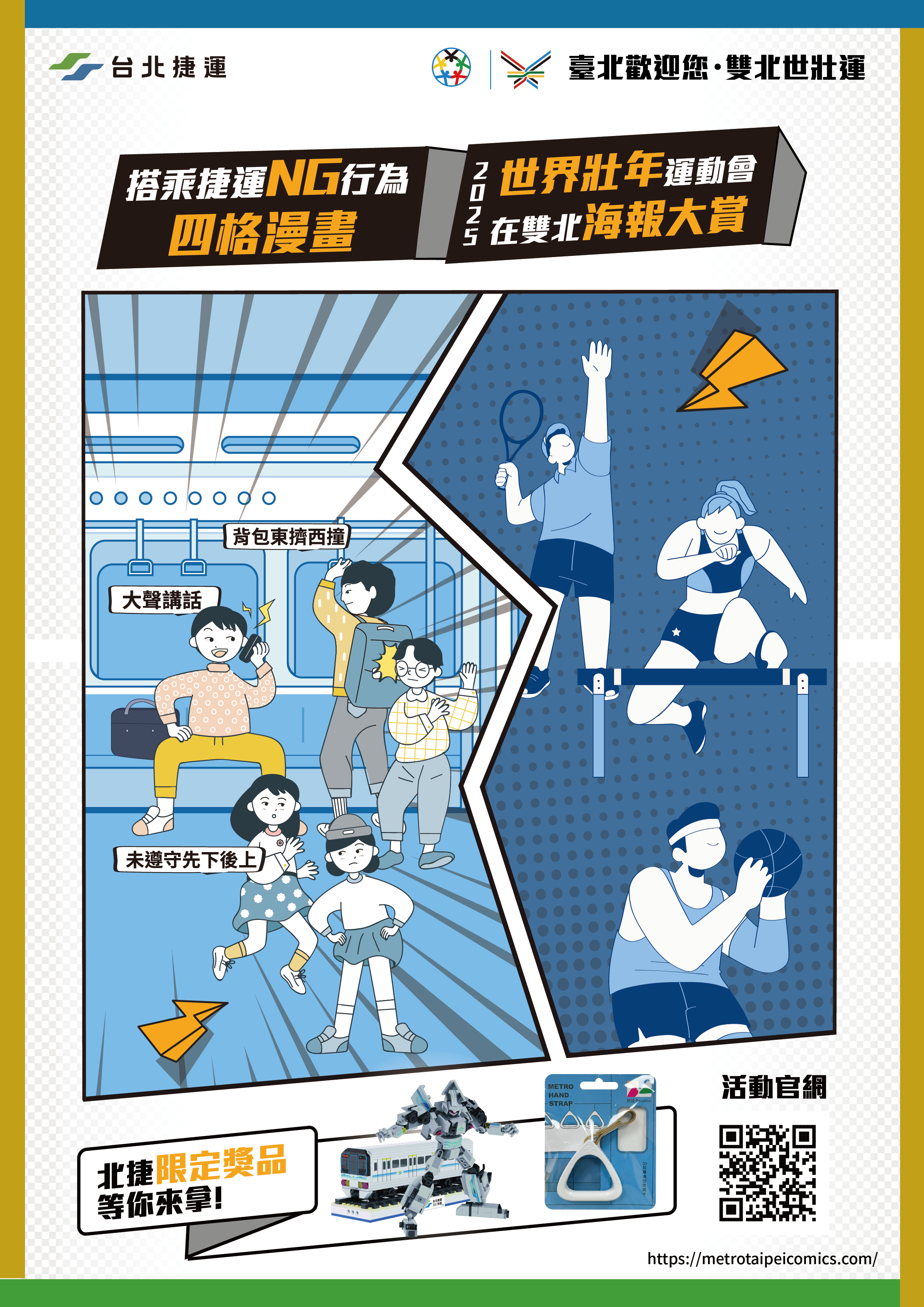 一、臺北大眾捷運股份有限公司於114年3月24日至4月6日舉辦「搭乘捷運NG行為四格漫畫」暨「2025年世界壯年運動會在雙北宣傳海報」徵稿活動