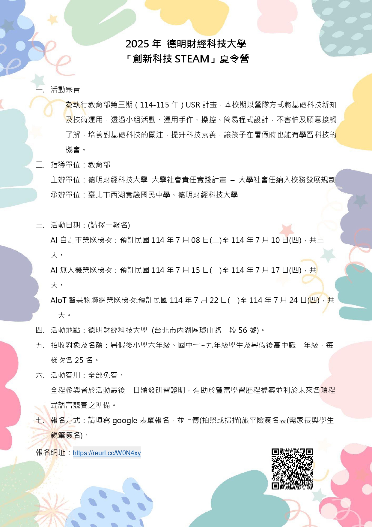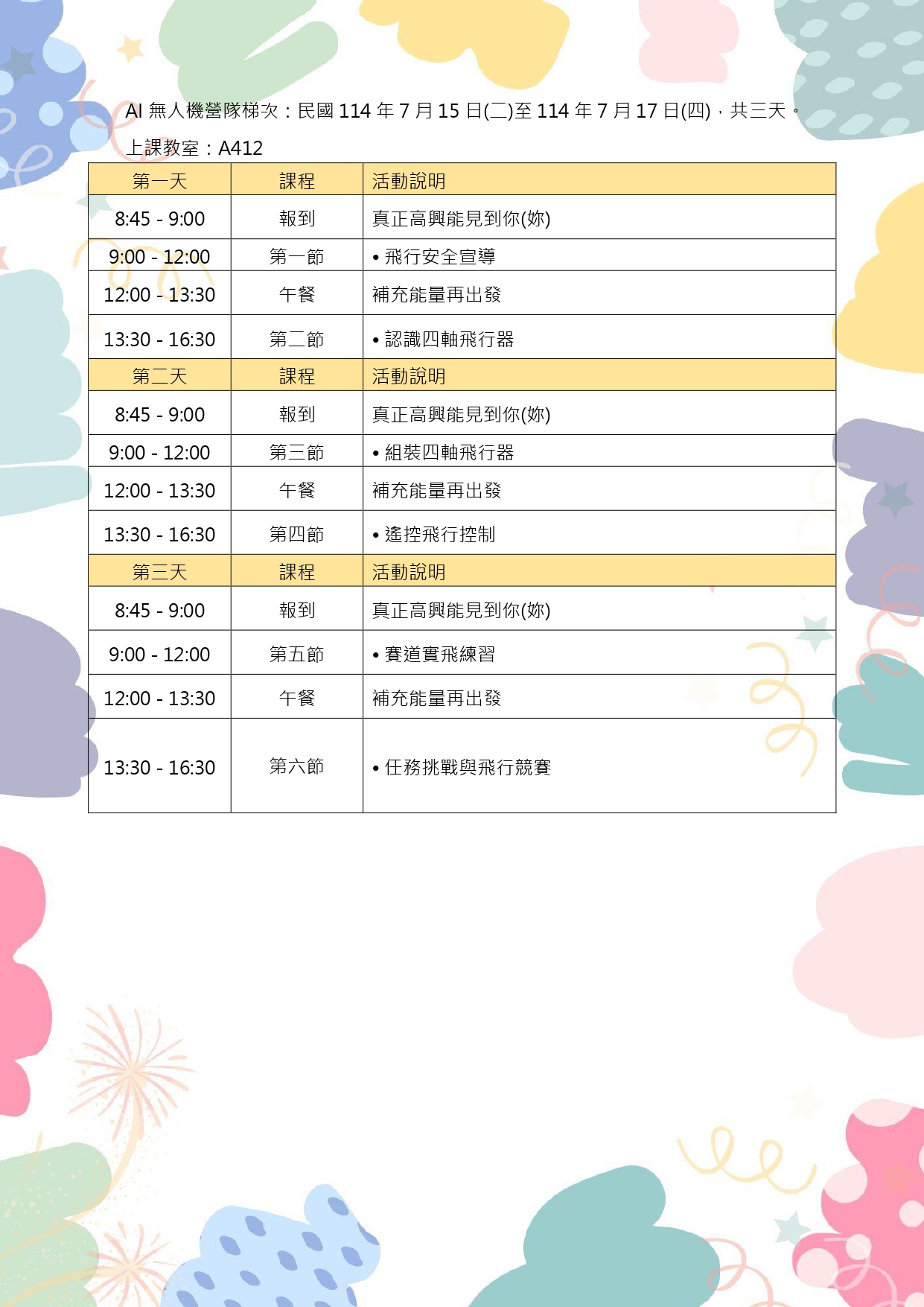 2、AI無人機營隊:預計114年7月15日(二)至114年7月17 日(四),共三天。