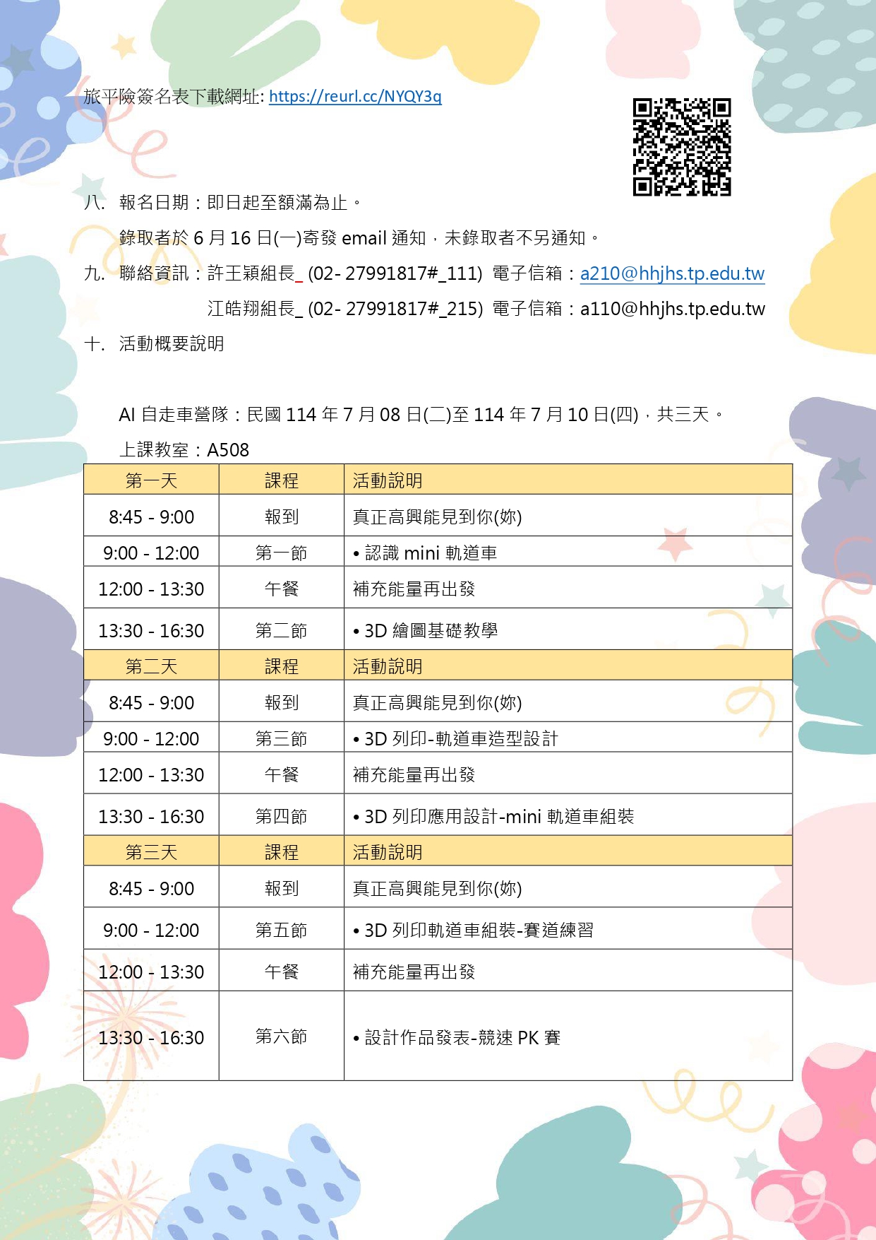 (五)報名方式:請填寫Google表單報名,並上傳(拍照或掃 描)旅平險報名表(需學生與家長親筆簽名)。