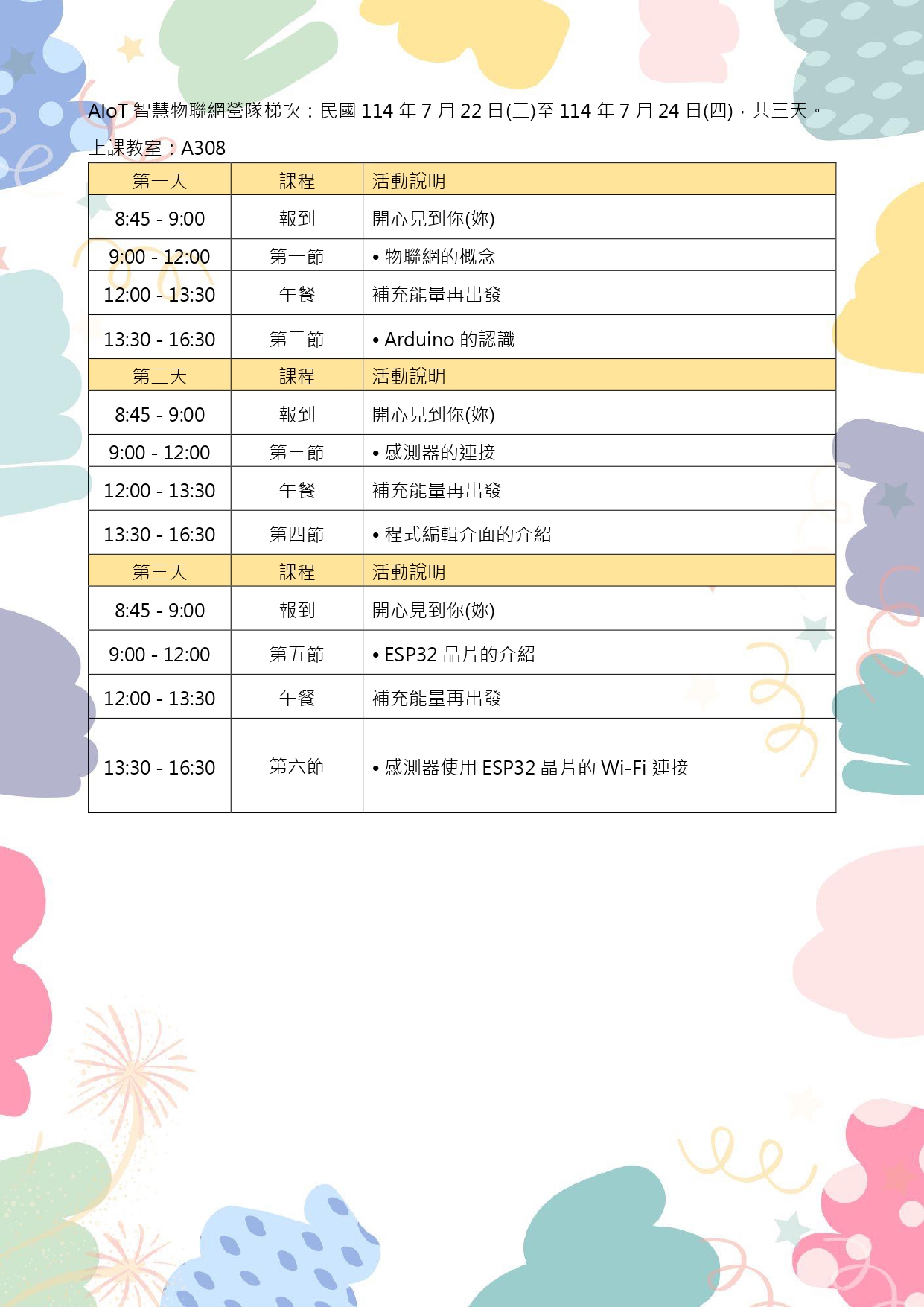 3、AIoT智慧物聯網營隊:預計114年7月22日(二)至114年 7月24日(四),共三天。