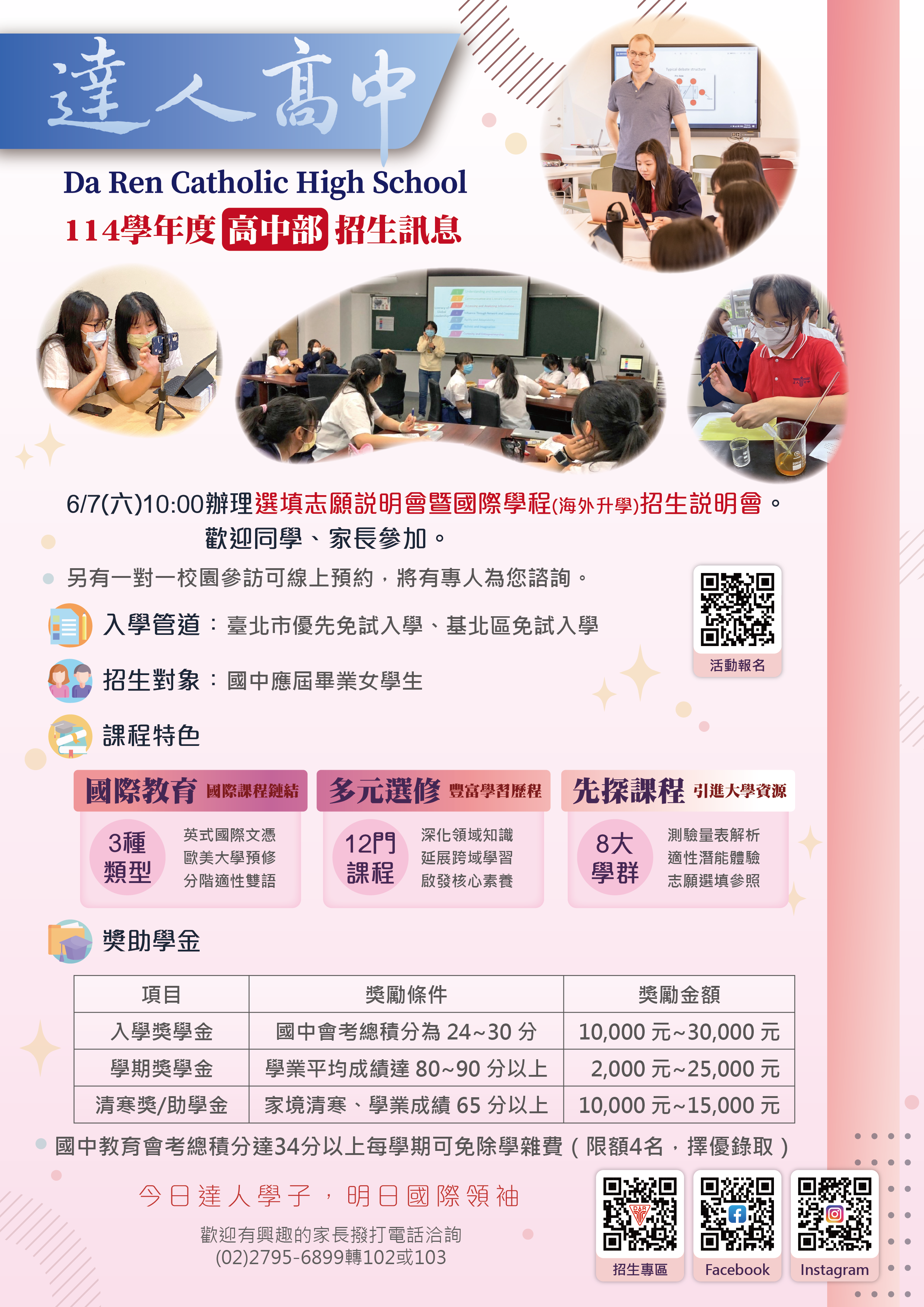 二、該校訂於6月7日(星期六)上午10時辦理志願選填說明會暨國際學程(海外升學)招生說明會,歡迎九年級女學生及 家長踴躍報名參加,活動報名連結:https://reurl.cc /vQLzll。