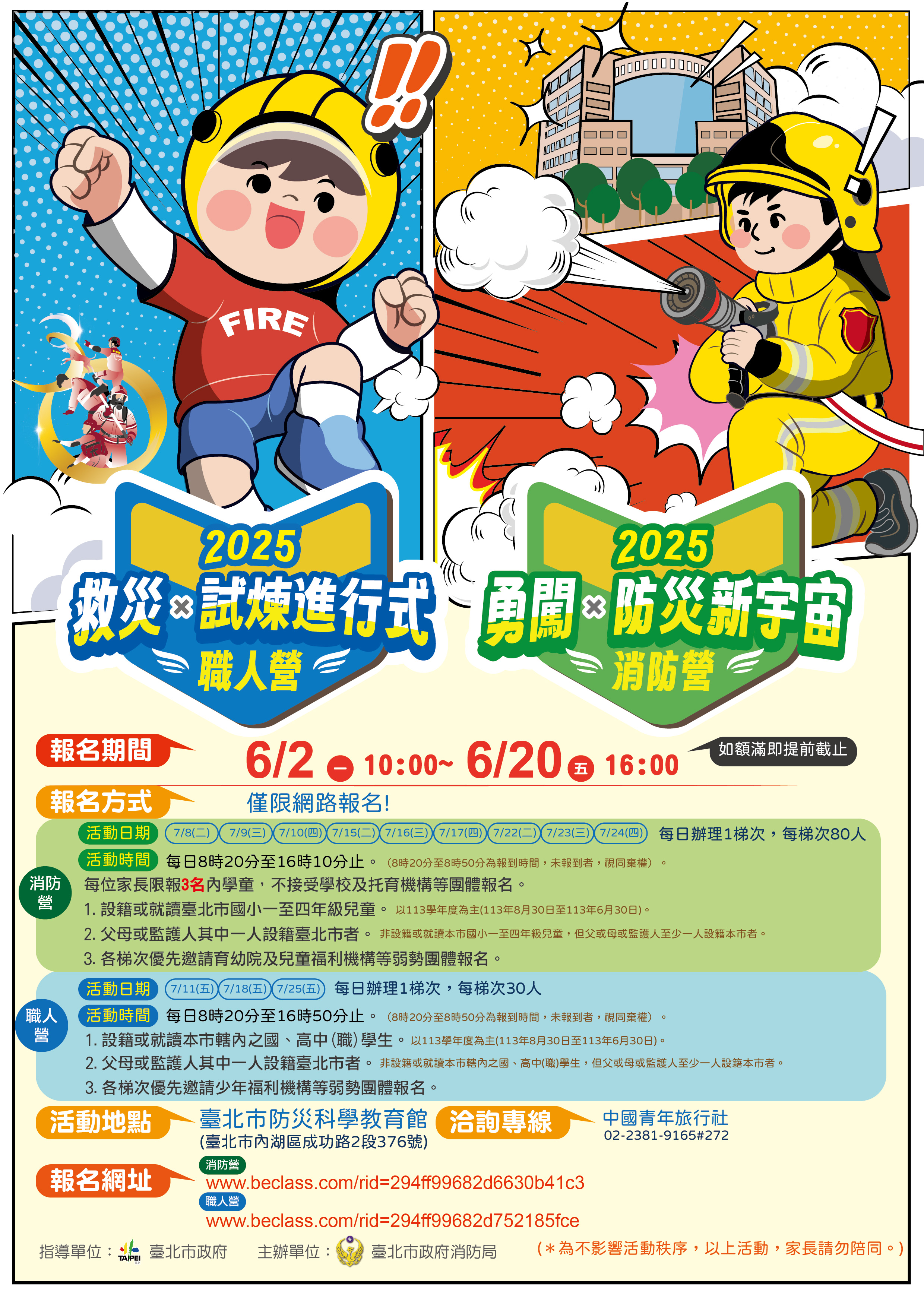 有關消防職人營第三梯次(114年7月25日)尚有名額可供報名,報名期間自114年6月2日10時至6月20日16時止(如額滿即提前截止),欲報名者請至前述報名網址進行報名。