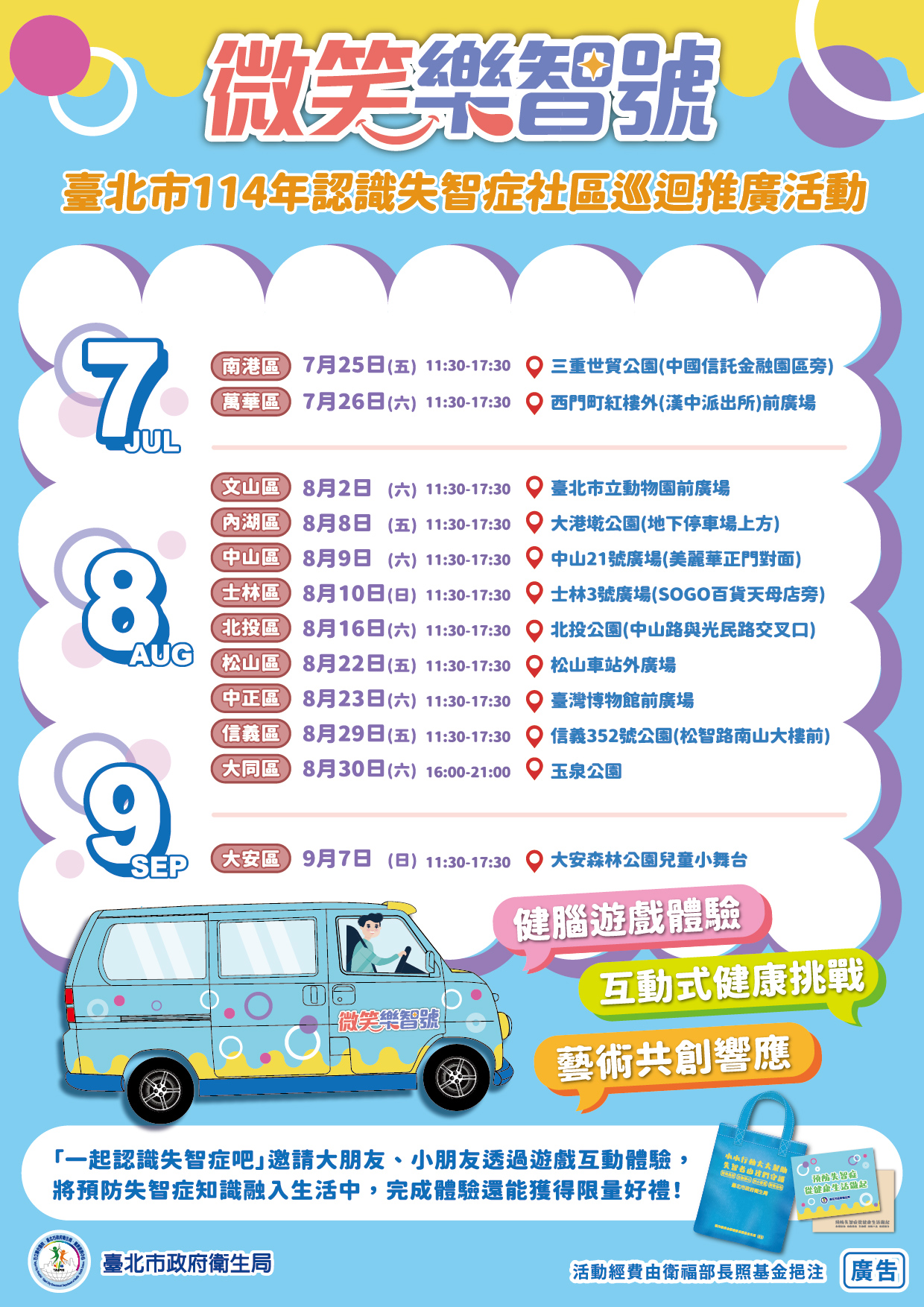 為增加民眾對失智症的認識及預防,本局114年結合「微笑 樂智號」胖卡車,規劃「健腦遊戲體驗」、「互動式健康 挑戰」、「藝術共創響應」等多元內容,巡迴本市十二行 政區,藉由趣味互動吸引民眾參與,將失智症知識融入生 活中