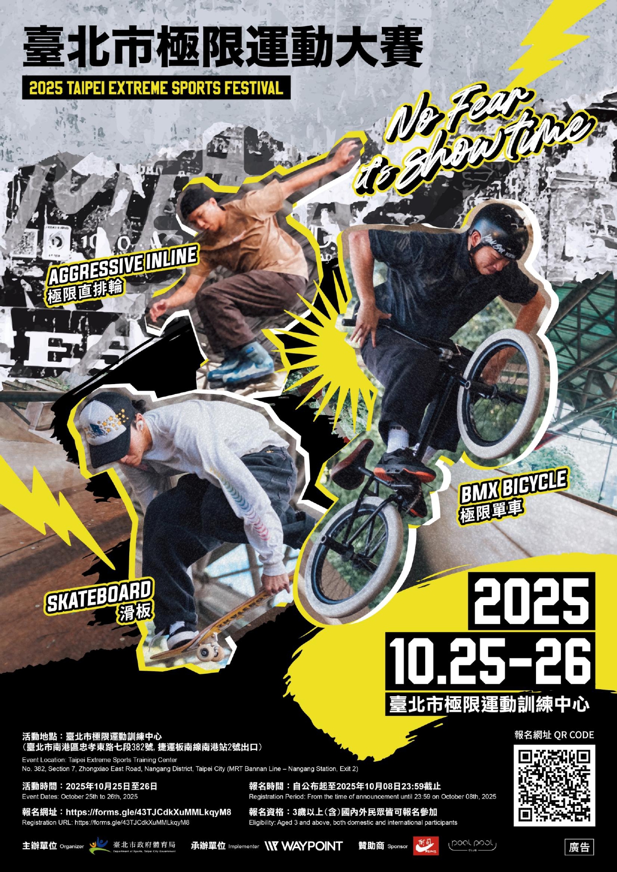 2025臺北市極限運動大賽熱烈報名中,項目有極限單車、極限直排輪、滑板,邀請喜愛運動的民眾共襄盛舉,活動詳情請見簡章及官網。 請參考賽事簡章,參賽報名等相關問題,請逕洽該公司林小姐:(02)2579– 1710,聯絡時間:週一至週五上午10時至下午5時。