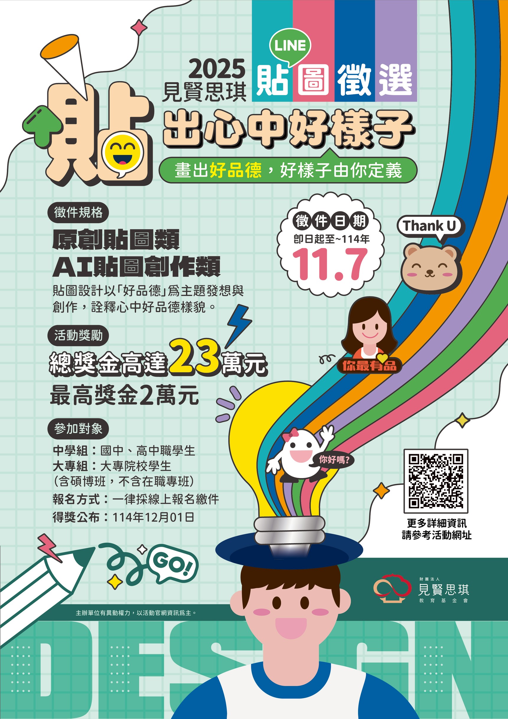 本次徵選項目為「品德貼圖」,參賽作品將經由評選出得獎作品,並予以獎金與獎狀表揚,得獎者需出席頒獎典禮。活動資訊:https://pse.is/84tdgx。相關活動問題請洽承辦人:林睿哲專員,聯絡電話:(02)2308-0608。