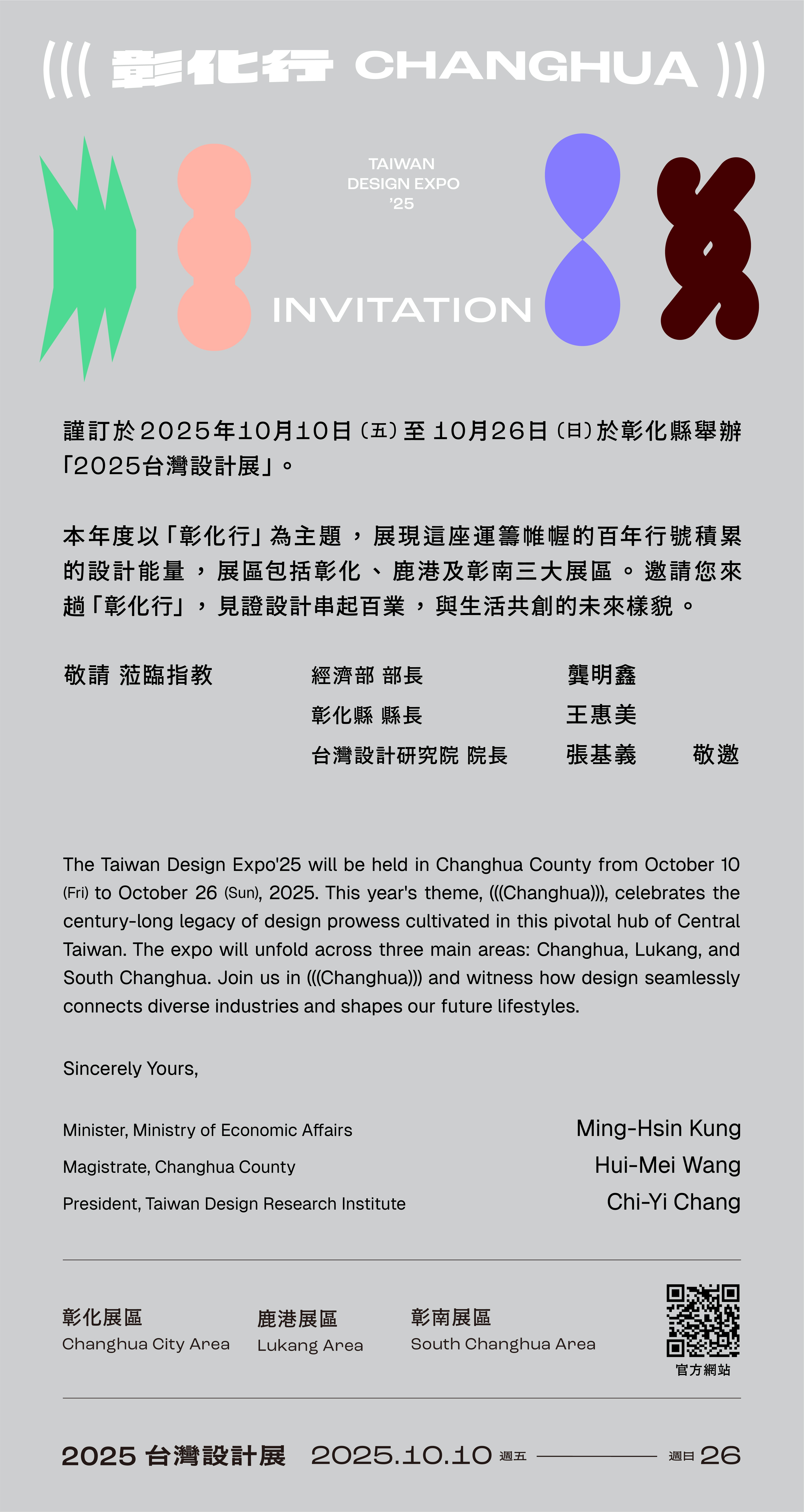 2025台灣設計展主題為「彰化行 (((CHANGHUA)))」,由設計師聶永真操刀,匯聚700位設計師、1,640家廠商及600家在地店家參與,展覽橫跨彰化、鹿港、田中、田尾等地,規劃三大展區與15個主題展,完整呈現彰化的產業、文化與創意。展區參觀時間為每日上午10點至下午6時,週五週六延長至晚間8點。相關活動展覽資訊可連結至2025台灣設計展活動官方網站:https://designexpo.org.tw/designexpo/zh-TW/visit。