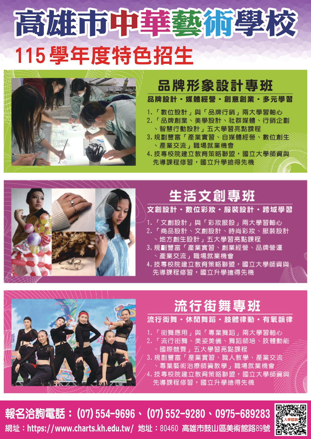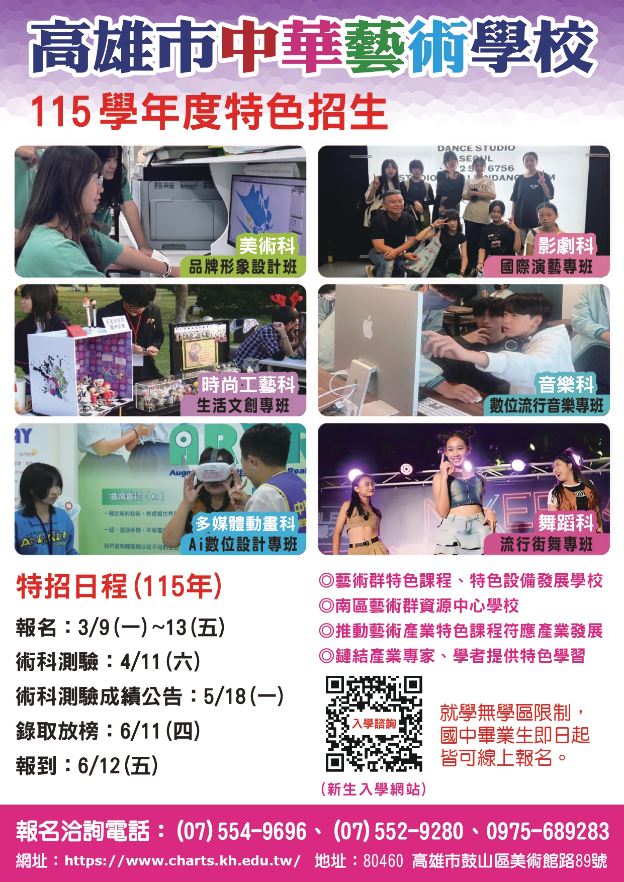 一、該校日間部正規班115學年度熱烈招生中,入學方式計有高 雄區完全免試入學、免試入學、技優甄審及特色招生等管道。 二、115學年度特色招生將於115年3月9日至3月13日受理報 名(不分學區皆可報考),招生科班計有美術科、多媒體動 畫科、時尚工藝科、影劇科、音樂科及舞蹈科。